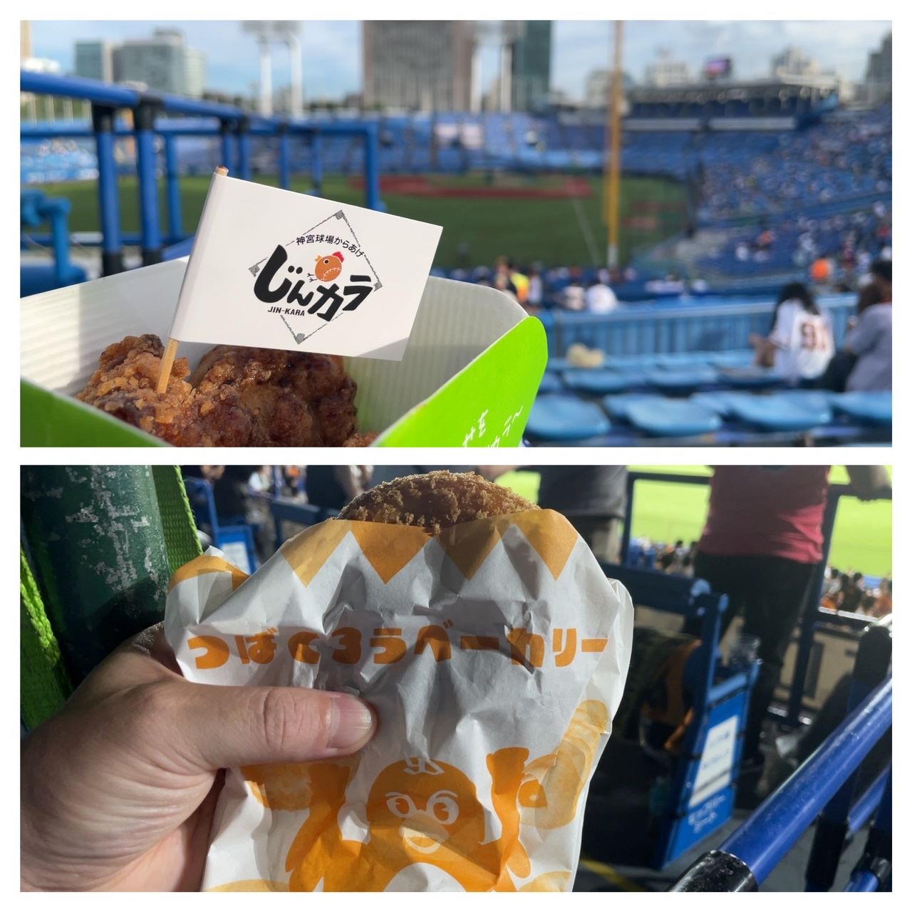 久々だったので、球場グルメで神宮のから揚げ略して「じんから」と、つば九郎のカレーパンを食べた。