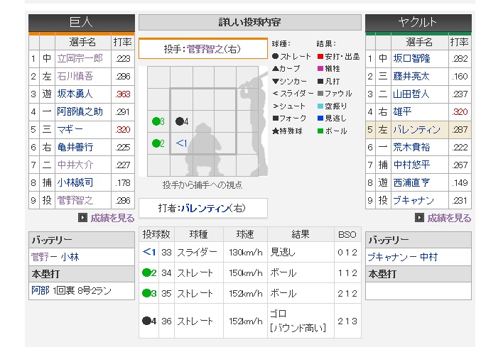 打った瞬間はタイミング的にセーフかもなあ、って当たりを軽々とアウトにする。なんでもないように捌いてるけど、これはすごいと唸らされる守備が3回あった。そして、レフトへぶっ放したホームラン。クルーズの場合、上の首脳陣から干されてる感は否めないし、他の外国人も好調なもんだから非常に使い方が難しい。でも、こいつはここにいちゃいけない。攻守に冴えを見せた後に強風のせいでフライを落球して、その後の打席で気のない三振をしたとこまで実にクルーズなんだけど、それでもこの選手は上にいるべきだしジャイアンツに必要だよ。