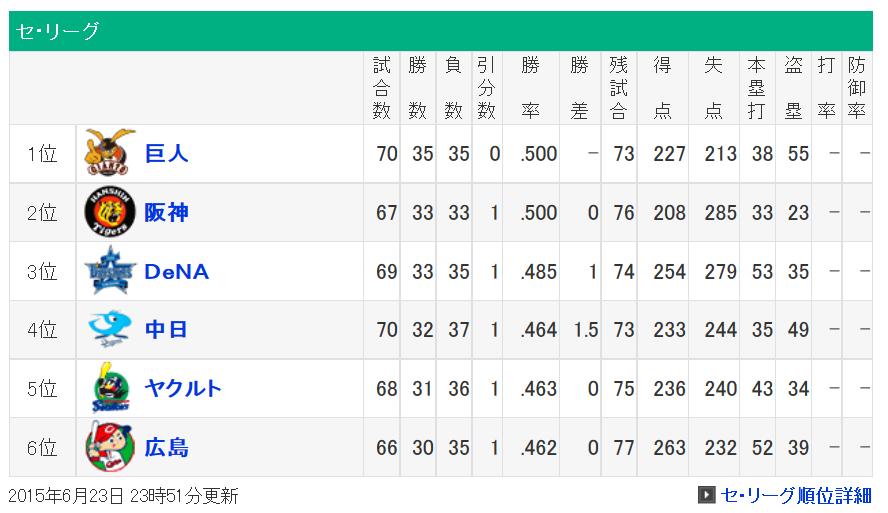 これで交流戦終了。割りに順調だった前半戦はどこへ、後半戦まさかの1勝8敗。この10日間で1勝しかできてないスーパー大失速。ところが10連敗のベイスを始めとして他所もさっぱりだから首位のまま。ふざけた見出し風にしてみれば