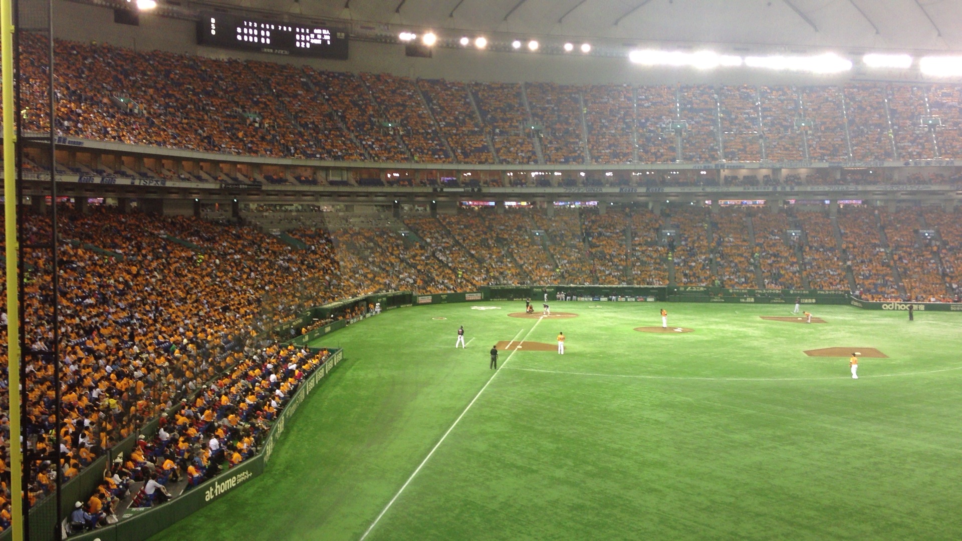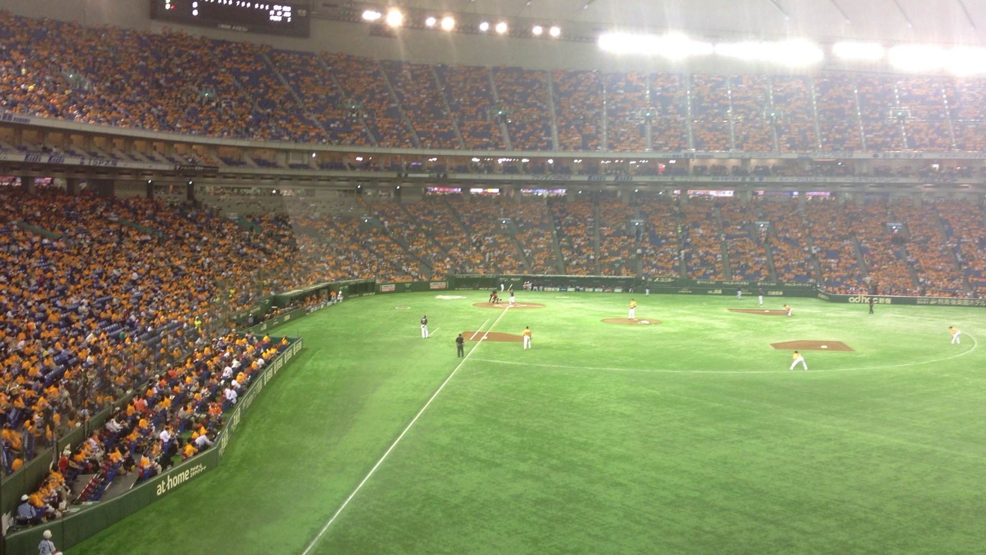 ところが、場内券売所に着いて話は暗転。そこでは当日券の買い替えシステムはやってないとのこと。おまけに場外で当日券を売ってるところとの情報伝達もできないそう。ここまで来るのがやっとのおばあちゃん方を見捨てる訳にもいかず、管理人が一旦ドーム外の当日券売り場まで行って確かめるも、連番で買える席はもう無いとの無情なお返事。管理人はろくでもない人間のくせに、たまにこうしていい人のフリをしたくなるのだが、今回は結局いいことをしたんだか悪いことをしたんだかよくわからん結果に。ただ、おばちゃん方にはえらく感謝され、お年寄りにありがちな無理矢理お金を握らされた上にハグまでされたw おばあちゃんたち、役に立たなくてごめんね。でも、試合開始後の状況を見るとやっぱり立ち見エリアはキビシかったと思う。ドーム観光して帰るって言ってたけど、少しは楽しんでもらえたかしら。