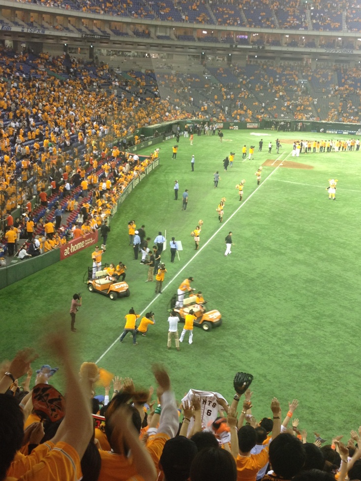 管理人が自分の席を見付けたところ、その席に座ってるおばあちゃんが。「そこ、俺ですよ・・・」と話しかけると、疲れてちょっと休んでいたとのこと。聞けば、そのおばあちゃんともう一人のおばあちゃん二人で初めてドームに来て、立ち見席の大変さに疲れ果て空いている席で休んでいたとのこと。後楽園の頃は何度も来たけどドームになってからは初めてなんてお話しされてた。